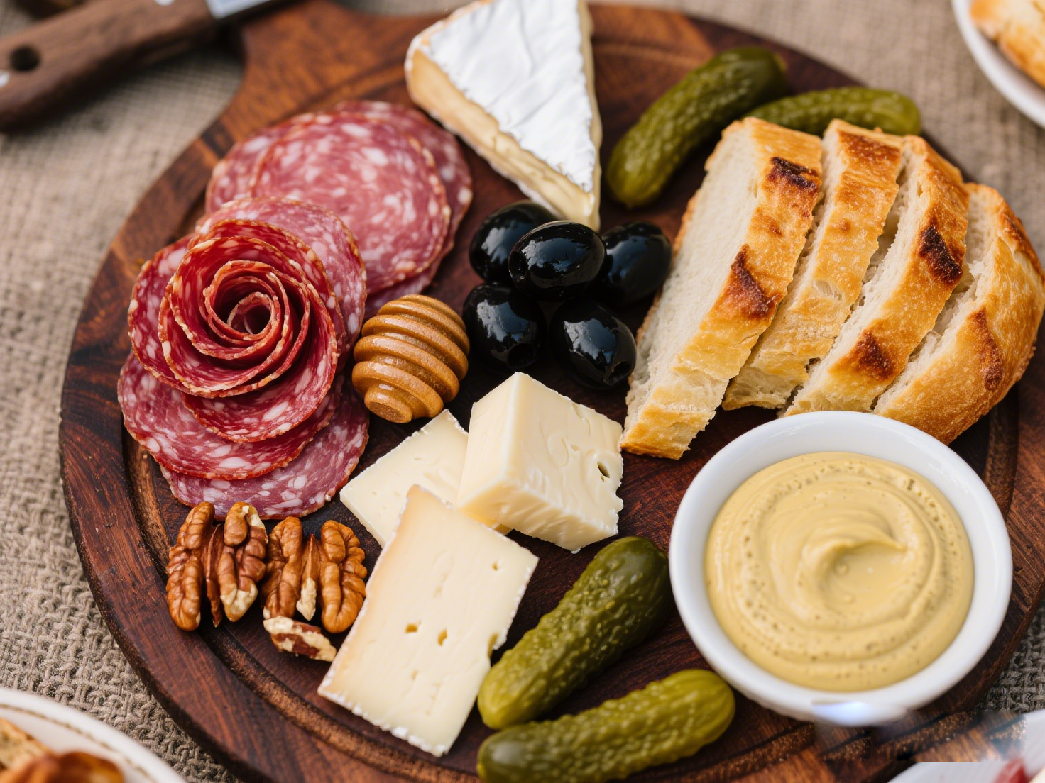 ② 在木質(zhì)砧板或大號平盤上,將薩拉米、奶酪、堅(jiān)果、橄欖等分區(qū)錯落擺放,形成豐富的視覺層次;