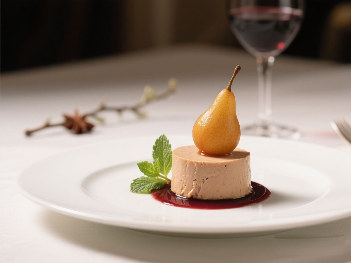 特點:紅酒煮梨的酸甜完美平衡鵝肝的豐腴。