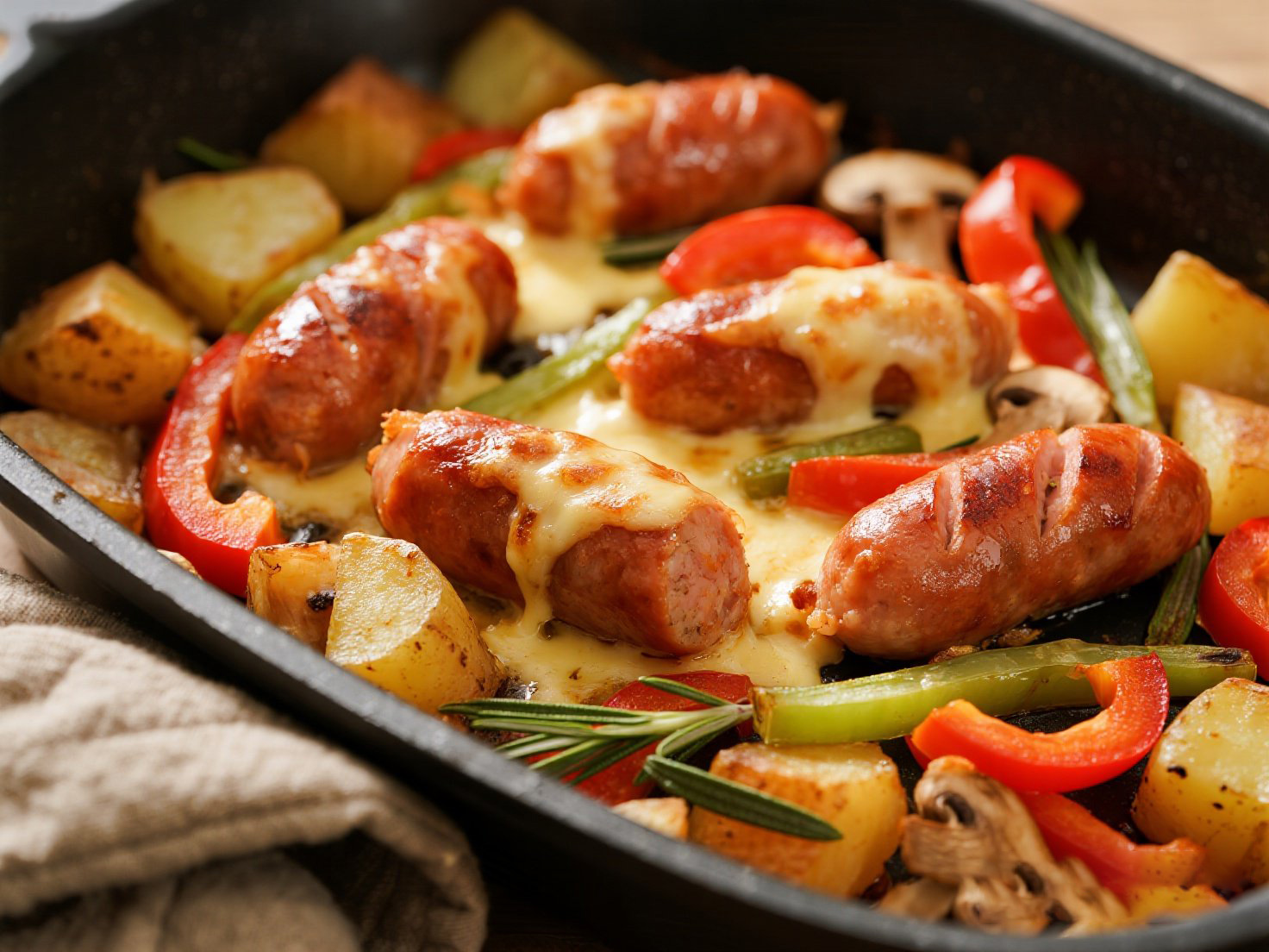 ① 蔬菜+油+胡椒拌勻 → ② 烤腸和菜蔬裹上調(diào)料,鋪進(jìn)烤盤 → ③ 200℃烤15分鐘(空氣炸鍋180℃12分鐘)→ 烤至熟透,搖勻開吃。