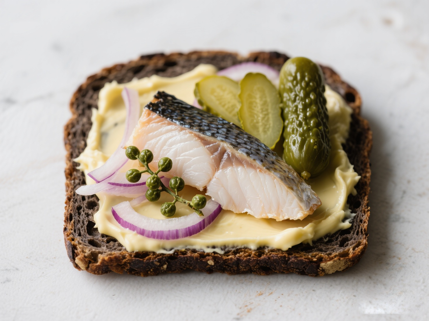 ① 準備基底:將黑麥面包烤熱或直接使用,均勻涂抹一層芥末蛋黃醬或奶油奶酪。