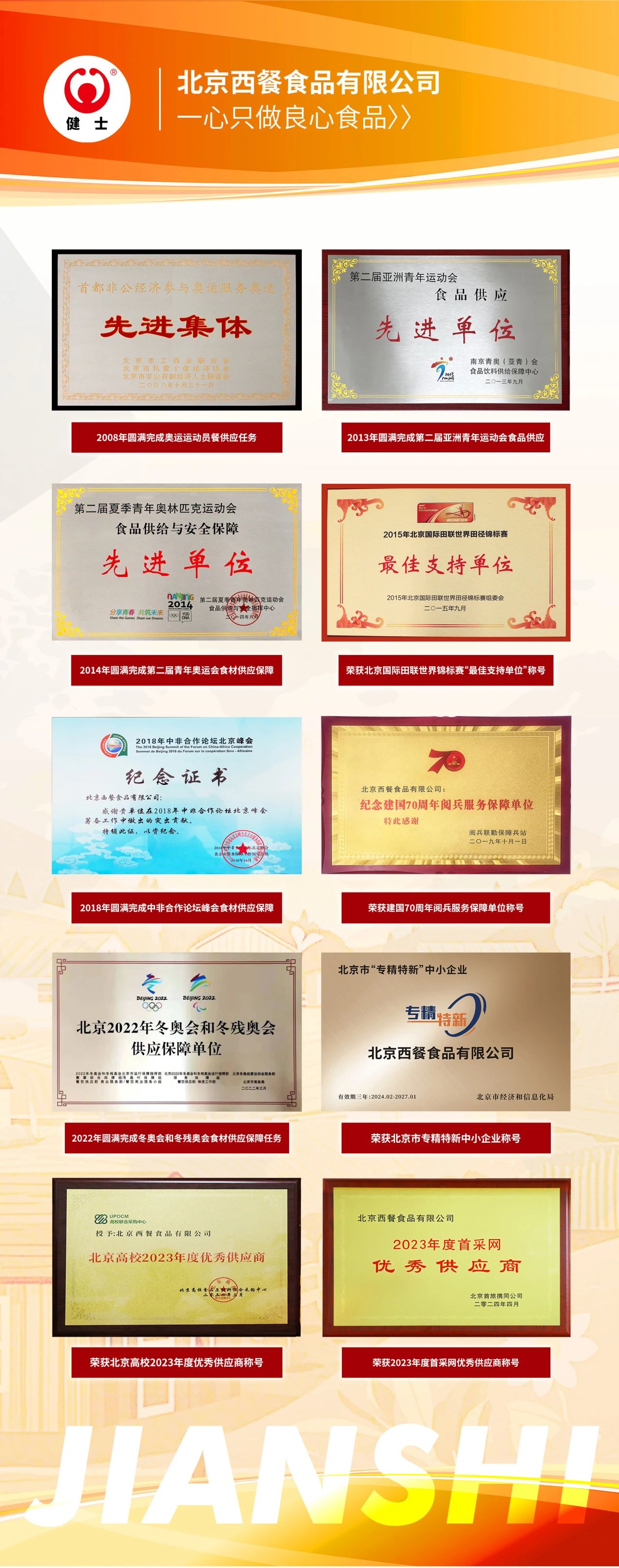 作為北京市高新技術(shù)企業(yè)、北京市農(nóng)業(yè)產(chǎn)業(yè)化龍頭企業(yè)、北京市專精特新中小企業(yè)以及北京市創(chuàng)新型中小企業(yè),公司通過 HACCP、FSSC22000 等國際體系認(rèn)證,憑借 “健士” 品牌的卓越口碑,連續(xù)服務(wù)北京奧運(yùn)會(huì)、冬奧會(huì)、一帶一路高峰論壇等40余項(xiàng)國家級(jí)重大活動(dòng),以零事故的保障記錄贏得贊譽(yù)。