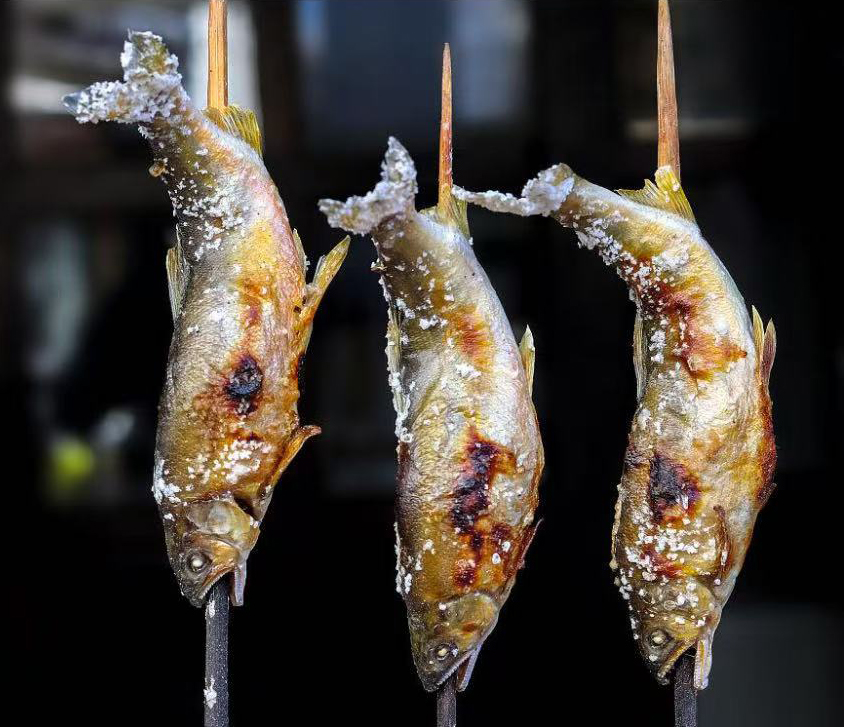 ◎爐端燒,現(xiàn)場烤制的虹鱒魚,散發(fā)著陣陣鮮香,魚肉鮮嫩多汁,口感細膩,一把鹽,一把火,吃魚最原始的味道!