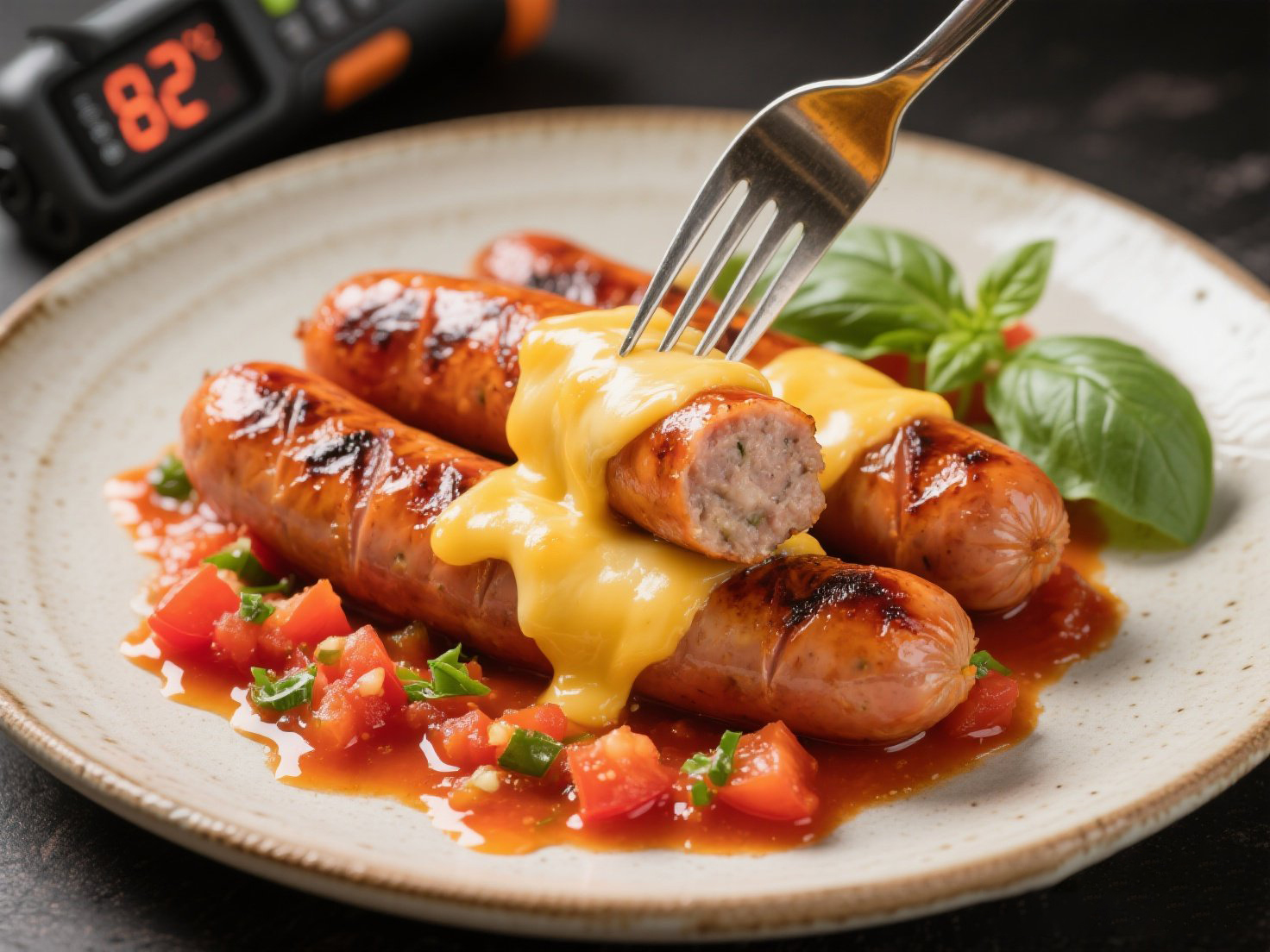 ③ 香腸裝盤 → 淋莎莎醬 → 撒帕瑪森碎